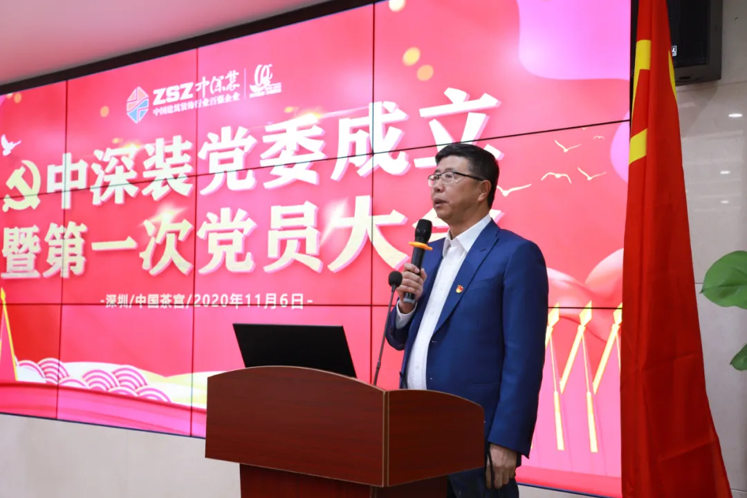 中深裝集團常務副總裁王武烈致歡迎辭。王武烈副總裁首先代表中深裝集團感謝各位領導蒞臨本次大會,感謝各級領導單位對中深裝集團黨建工作的支持和肯定,感謝在中深裝集團全體黨員同志為企業所做出的貢獻。中共中深裝黨委成立后,會繼續積極響應上級領導單位發起的各項號召,貫徹落實各項指導方針,為黨組織發展壯大貢獻力量。