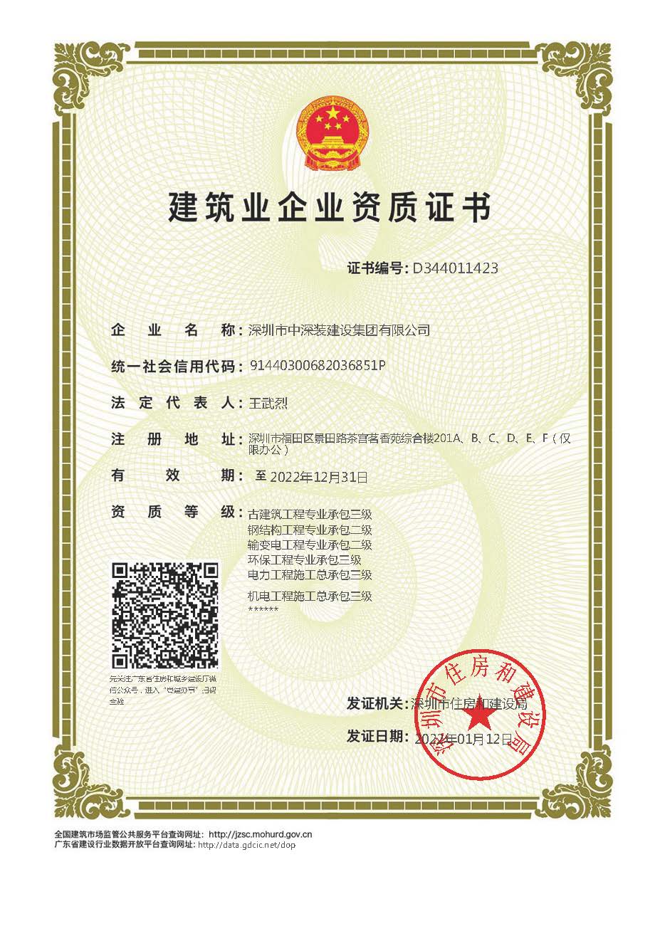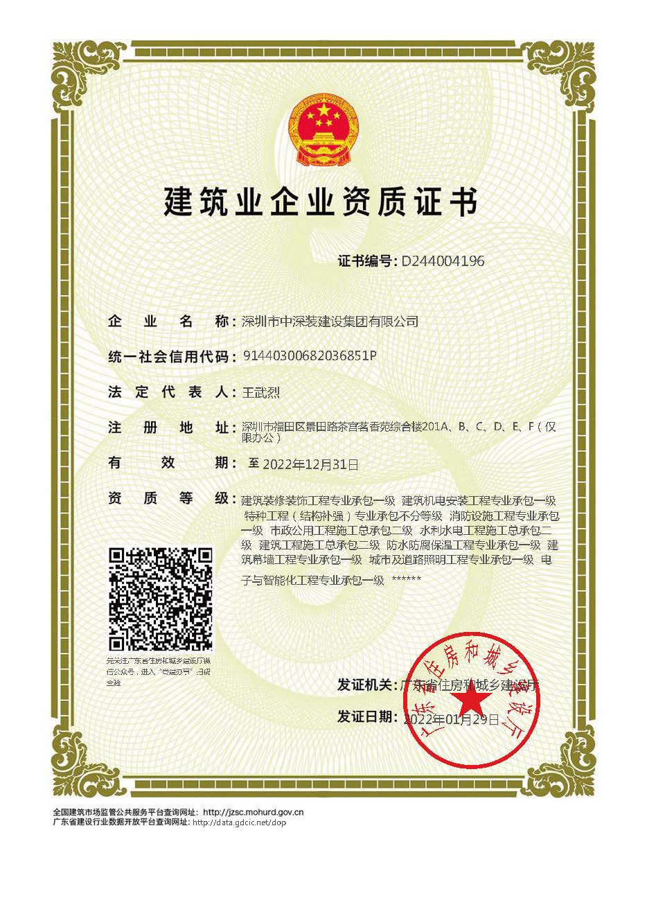 中深裝專業承包壹級總承包貳級證書電子證書