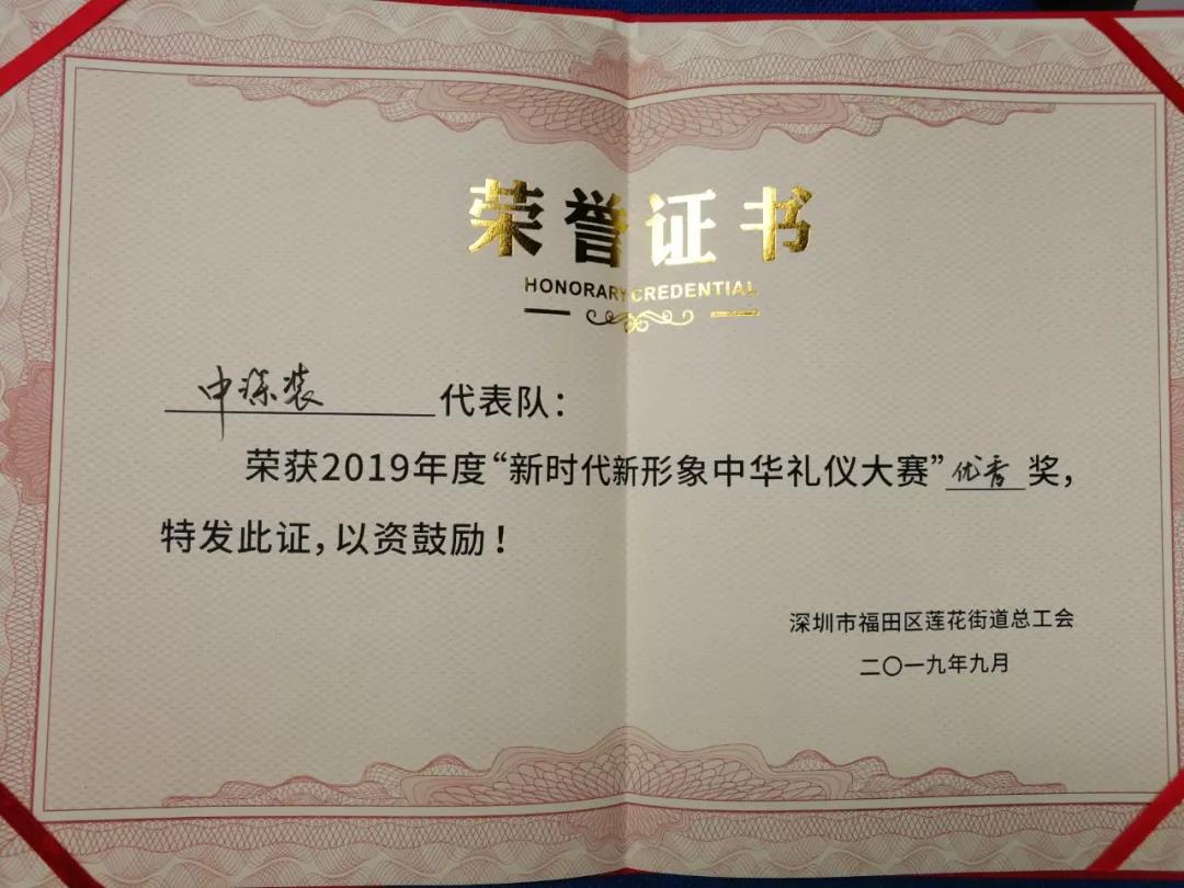 2019年9月16日,中深裝禮儀隊參加由福田區(qū)蓮花街道總工會舉辦的“2019年新時代新形象中華禮儀大賽”,并榮獲優(yōu)秀獎。
