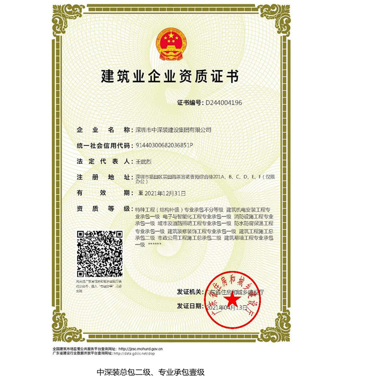 中深裝集團現擁有建筑機電安裝安裝工程專業承包一級、輸變電工程專業承包二級、電力工程施工總承包三級、承裝類電力設施許可證三級、承修類電力設施許可證三級、承試類電力設施許可證三級等專業資質,并擁有性能先進、配套齊全的送電線路和變電安裝調試工程所需的施工專業機械、工器具、設備,可承接110千伏以下電壓等級電力設施的安裝、維修或者試驗活動。