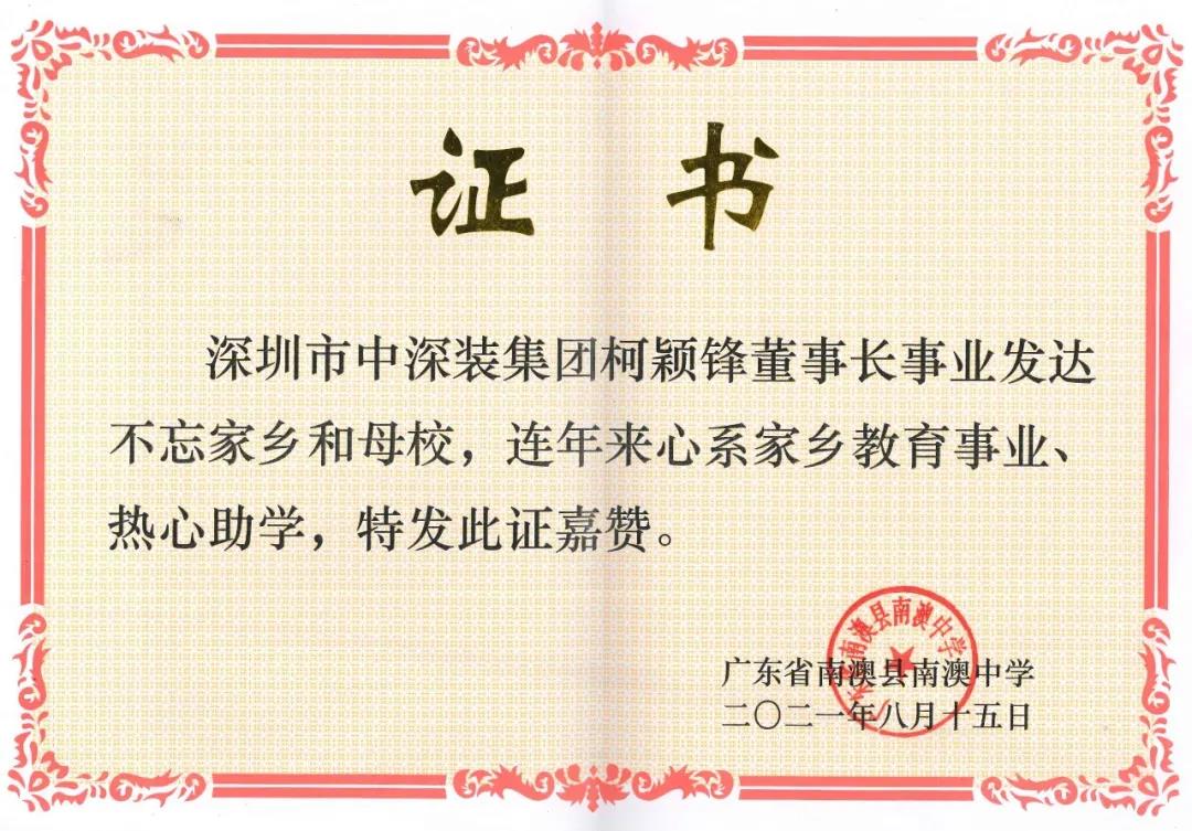 隨后,柯穎鋒董事長發言,并發言中提到:作為土生土長的南澳人,理應以實際行動支持家鄉建設,尤其是關乎未來發展的教育事業,因為一代又一代的莘莘學子就是我們的家鄉乃至整個國家的希望。“再窮不能窮教育,再苦不能苦孩子”,柯穎鋒董事長和中深裝集團以及深圳市南澳商會會竭盡全力幫助每一位暫處困境、自強不息的南澳學子。今年的“同心·圓夢”助學活動的受助對象又新增5名同學,去年新增的“優秀教師”和“優投線高考生”獎勵項目也開展順利,對獲得今年的優秀教師和優投線資格高考生,表示熱烈祝賀。柯穎鋒董事長同時提到,助學金不僅是物質的支持,更是一份愛的力量,中深裝集團以及深圳市南澳商會把“同心·圓夢”助學活動看作是一項公益事業,用心、用愛運營下去。祝福南澳中學的學子們學習進步、魚躍龍門,祝福南澳中學的教師們桃李天下,身體健康。