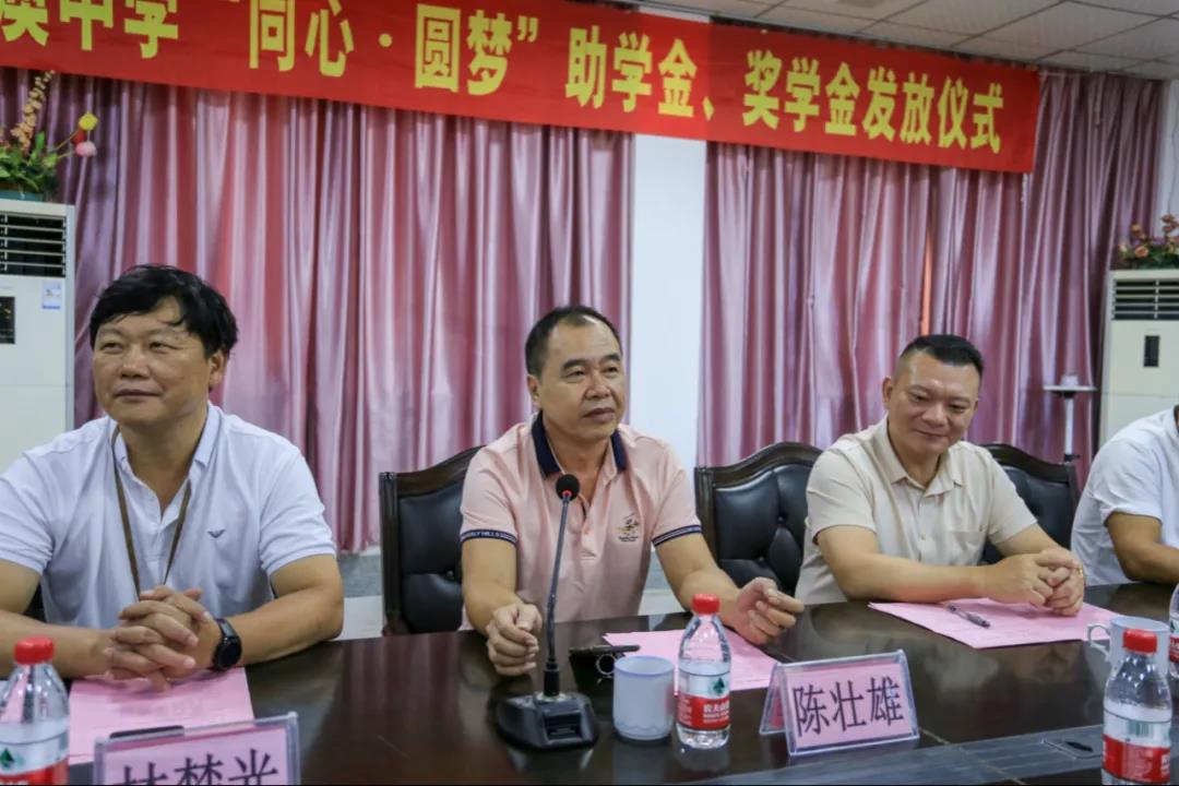 8月15日當天,南澳縣政協副主席陳壯雄、南澳縣政協文史委副主任李錦順、南澳中學校長林楚光、南澳中學黨總支書記陳奇南、南澳中學校領導洪俊河、南澳中學校長辦公室主任徐春來、南澳中學校長辦公室副主任楊斯忠、深圳市南澳商會常務副秘書長阮明山等領導,共同出席本年度“同心·圓夢”助學金及獎學金頒發儀式。