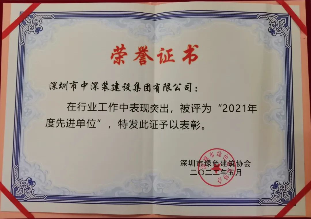 中深裝集團(tuán)榮獲“深圳市綠色建筑協(xié)會(huì)2021年度先進(jìn)單位”稱號(hào)。