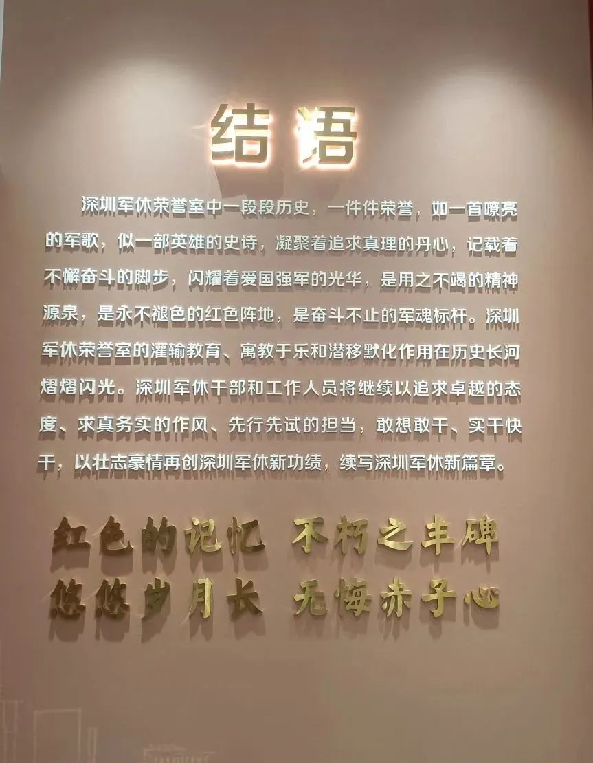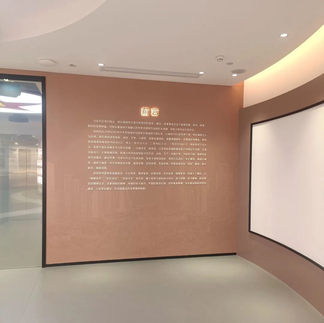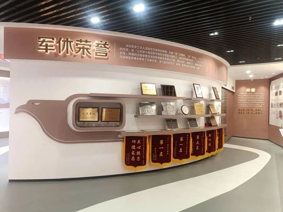 軍休榮譽室面積約265平方米,設有“前言、歷史沿革、崢嶸歲月、初心依舊、黨政關懷、軍休榮譽、結語”七個展區,是新建成的集史志展示、紅色教育、黨性教育和展現深圳特色軍休工作于一體的多功能、多媒體、現代化、特色化的展館。