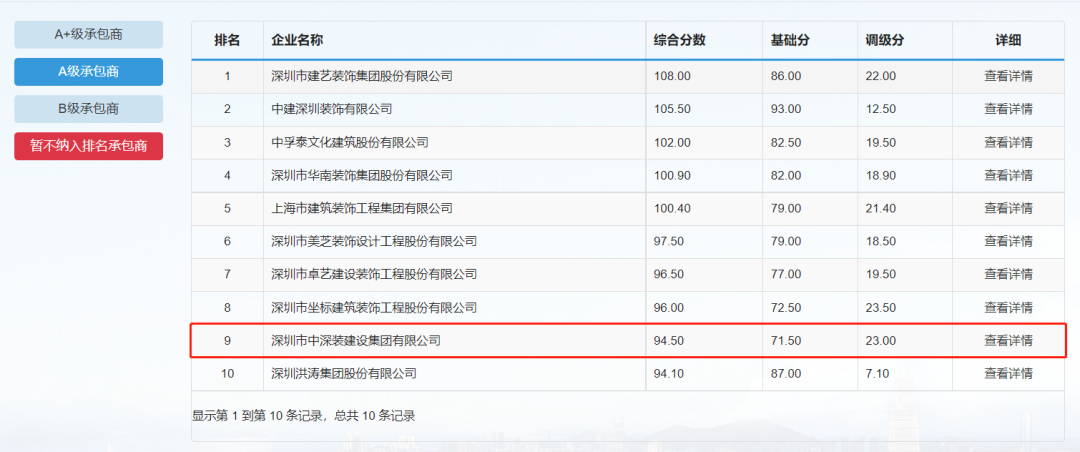 日前,從深圳市建筑工務署政府工程承包商分類分級管理信息平臺獲悉,中深裝集團在深圳市建筑工務署政府工程“A級承包商”排名提升至第九名,此次排名再度上升,彰顯了品牌影響力和市場競爭力持續提升,為進一步拓展深圳市場奠定了堅實基礎。