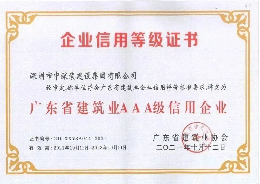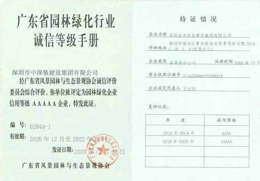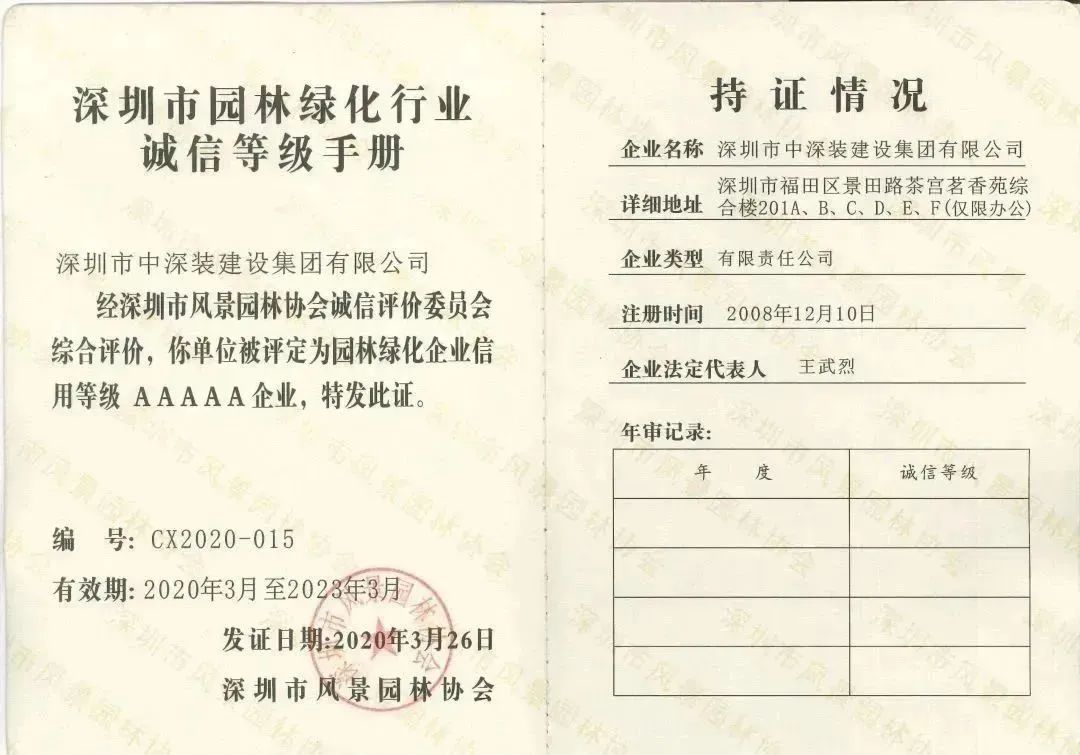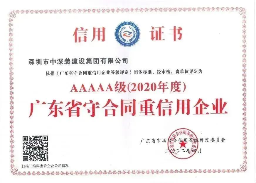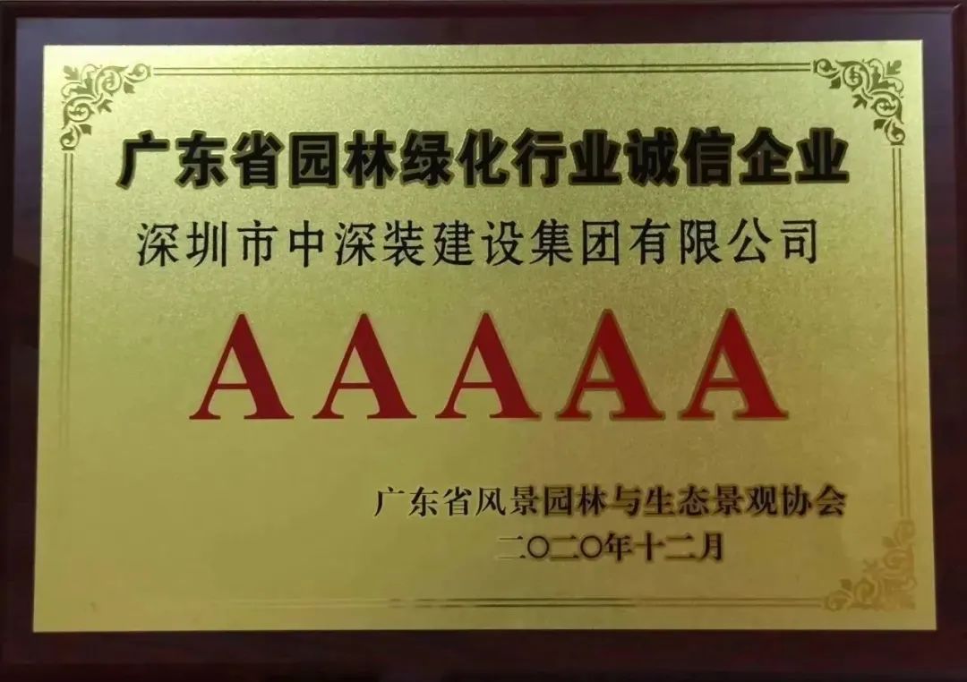 所獲”中國建筑裝飾行業信用等級AAA企業”、”廣東省守合同重信用5A級企業”、“廣東省建筑業 AAA 級信用企業”、”廣東省園林綠化行業誠信企業AAAAA“、”深圳市建筑施工企業裝飾裝修組AAA信用企業“等榮譽稱號,不僅是對施工質量的認可,更是對品牌誠信度的高度贊譽。