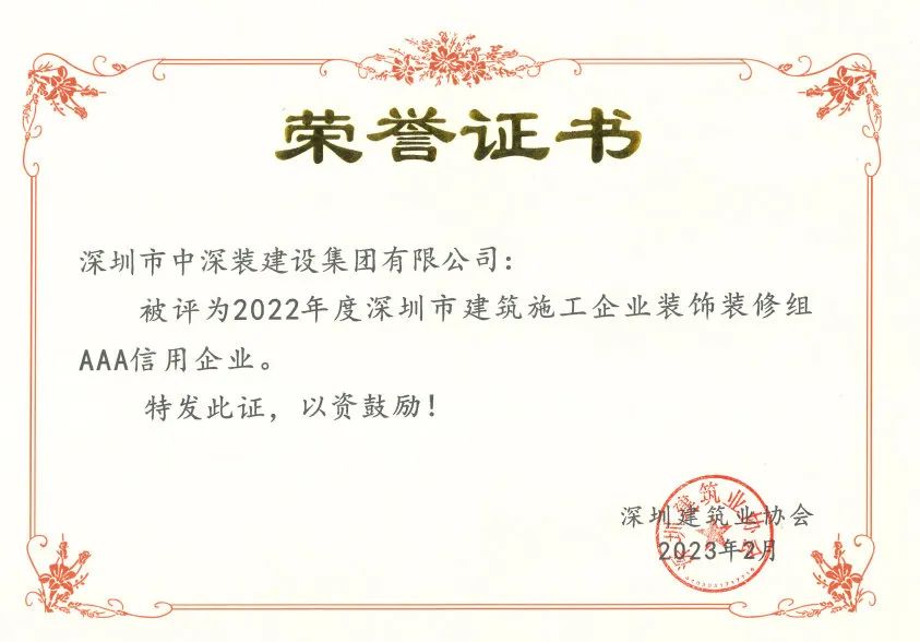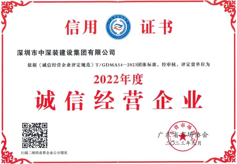未來,中深裝集團將以此為動力,繼續深入推進企業誠信經營、踐行守諾的信用意識,完善企業信用體系建設,堅持將誠信融入到品牌和企業文化建設中,不斷提升企業核心競爭力和品牌影響力,為客戶提供更高品質的服務和卓越的精品工程。
